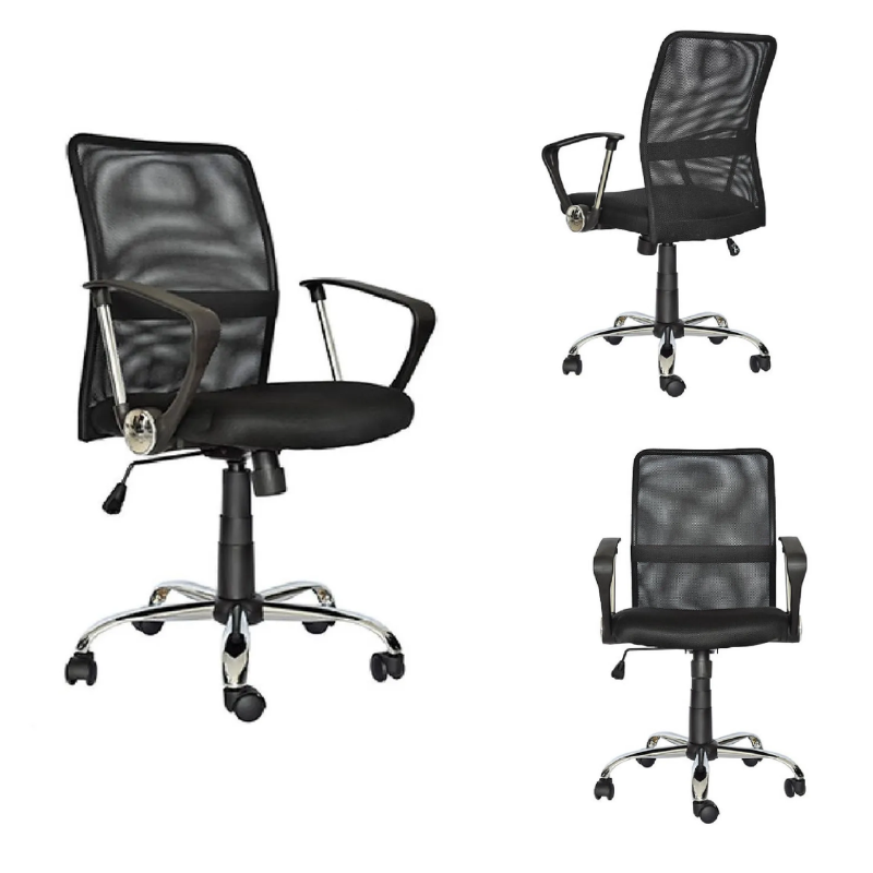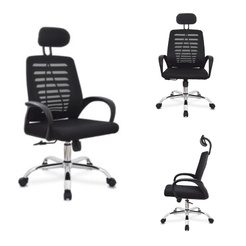 silla giratoria ejecutiva, asiento acolchado y tapizado en malla nylon, espaldar en malla nylon con marco de polipropileno y soporte lumbar, reposabrazos fijas, base de metal cromado, altura regulable con sistema basculante. colores disponibles: negro, gris, gris/negro, turquesa/blanco.