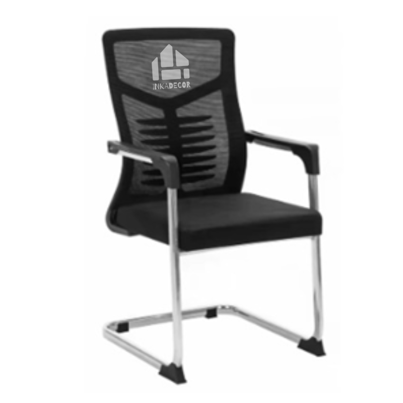 Silla fija trineo con estructura metalica, asiento acolchado y tapizado en malla, espaldar con marco de polipropileno tapizado en malla con soporte lumbar y repozabrazos fijos.