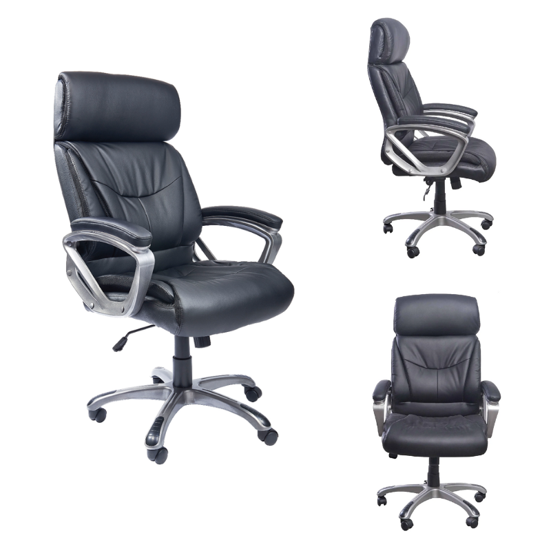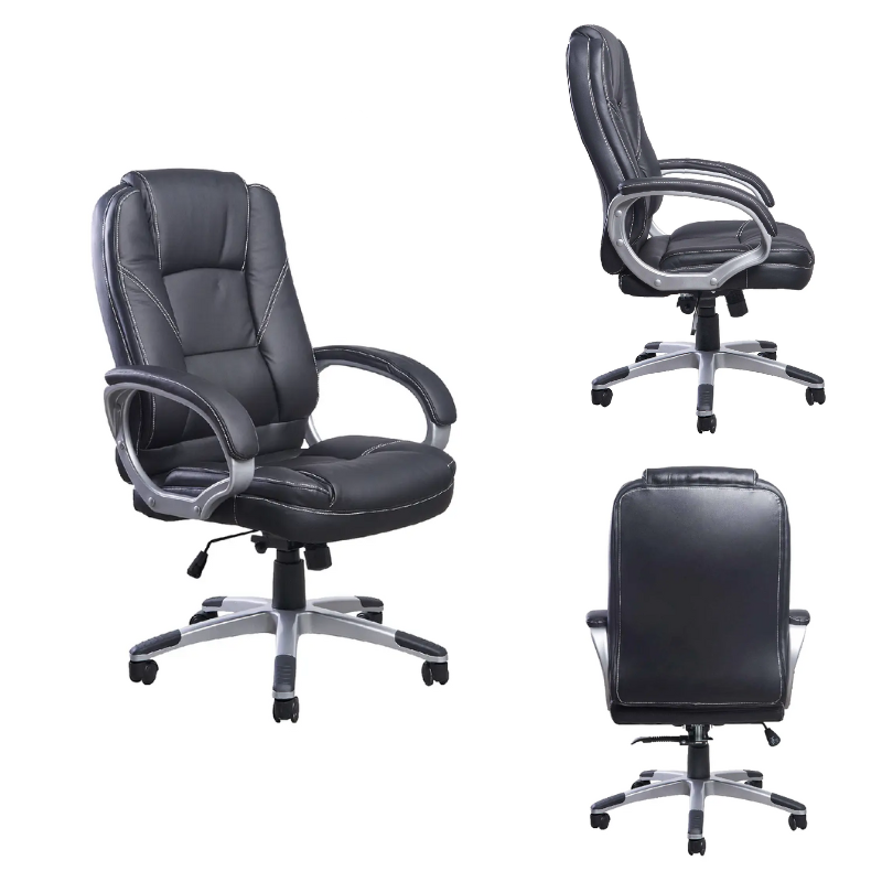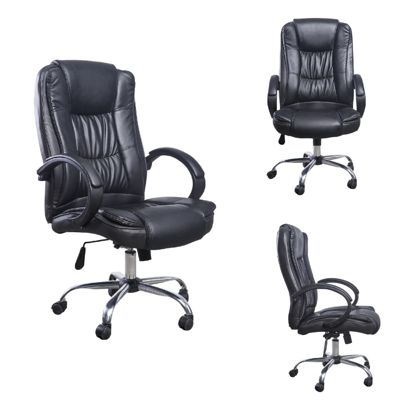 Espaldar alto y asiento de espuma laminada tapizado en cuero sintético, brazos fijos tapizados y estructura en polipropileno brindan resistencia y comodidad. Mecanismo LAP doble palanca y perilla de tensión que permite una regulación personalizada, base de metal cromado y ruedas de nylon que aseguran estabilidad y movilidad.