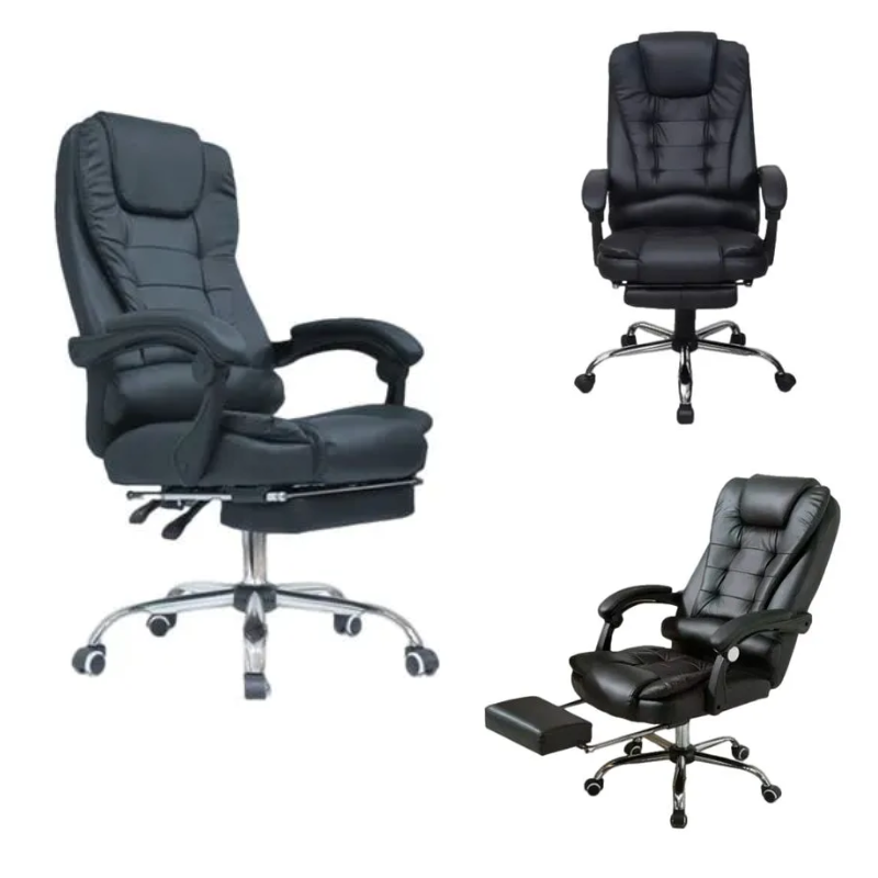 Silla giratoria en 360°, asiento acolchado con altura regulable, espaldar reclinable de 90° a 140°, reposabrazos acolchados, masajeador lumbar, reposapiés extensible acolchado, tapiz en cuero sintético, base de metal cromado.