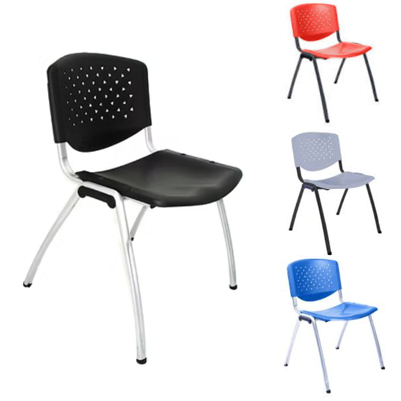 Respaldar y asiento en PVC, estructura metálica en color negro o aluminio, base fija 4 patas, Apilable. colores disponibles: negro, blanco, rojo, azul, naranja.