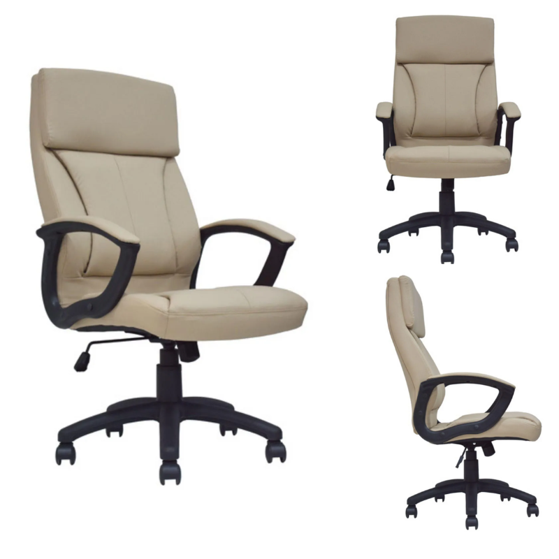 Espaldar alto y asiento de espuma laminada tapizado en cuero sintético, brazos fijos tapizados y estructura en polipropileno brindan resistencia y comodidad. Mecanismo basculante con 1 posición de bloqueo y perilla de tensión permite una regulación personalizada, base de polipropileno y ruedas de nylon que aseguran estabilidad y movilidad.