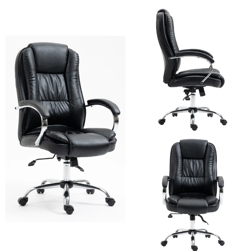 Tapiz ecocuero con soporte lumbar, mecanismo LAP doble palanca, brazos cromados acolchados y tapizados, base cromada, garruchas de nylon.